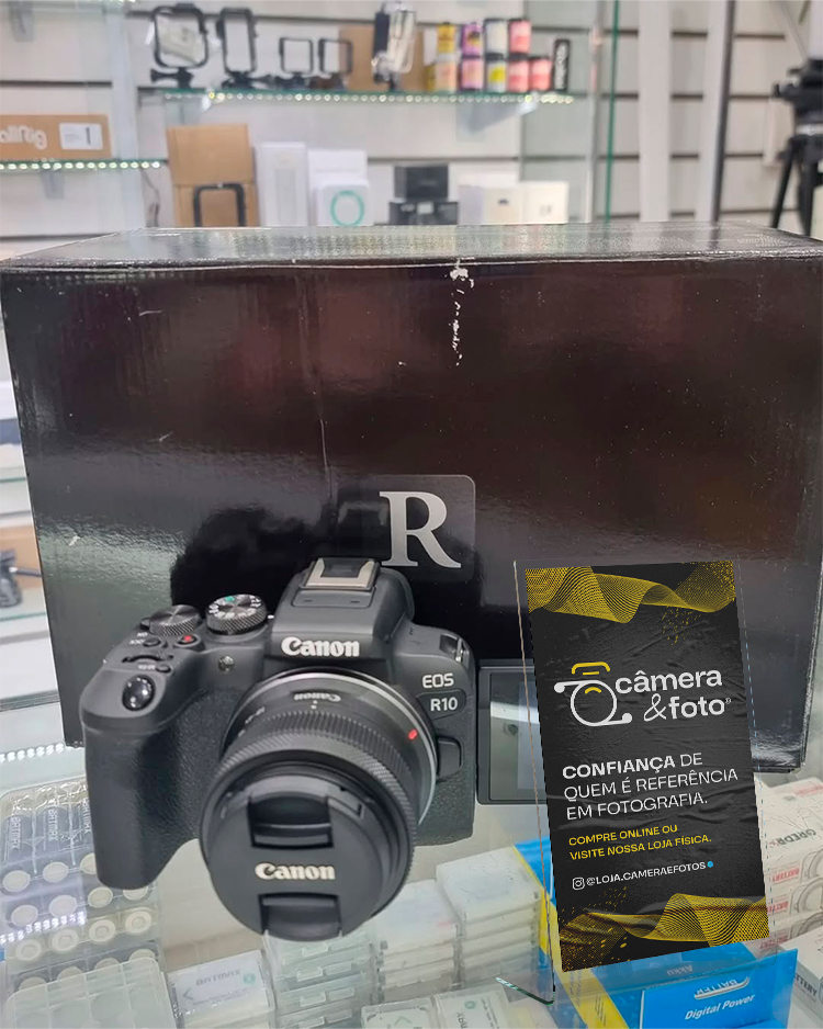 A Canon R10 é uma mirrorless APS-C moderna, perfeita para quem quer fotos e vídeos de alta qualidade com recursos avançados e desempenho rápido. Ideal para iniciantes avançados, criadores de conteúdo e vloggers! 🔥